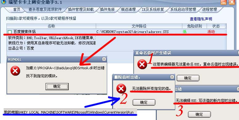 无法完全删除“百度搜索伴侣”,每次重启都会有检测到有垃圾在。