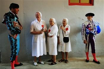 2006年7月14日,护士们与西班牙斗牛士在开赛前攀谈。