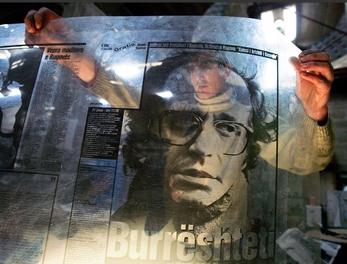 2006年1月22日,一个工人在准备将前科索沃总统的照片放在特别出版物的封面。