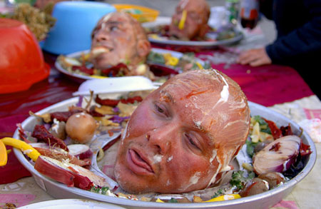 2006年1月14日,马其顿一个村庄举行的宗教仪式。当地村民扮成装在盘子里的人头。