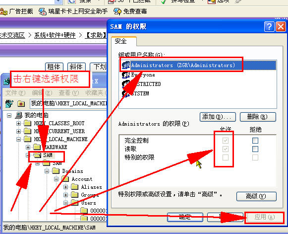 这个不难办到,只要在注册表中下面的路径中展开即看到它,“我的电脑\HKEY_LOCAL_MACHINE\SAM”找到这个键值击右键选择权限,并且赋序Administrator的权限(不过首先要以系统超级管理员(Administrator)的身份登录,)才能有权限修改它,再刷新一下,参见下图片所示,即可看到下面子文件夹了,这时在修改之前将“我的电脑\HKEY_LOCAL_MACHINE\SAM\SAM\Domains\Account\Users”这个键值导出来作个备份,比如将备份为“Guest.reg”以免有后悔的一步,作了备份之后就可以将下面“我的电脑\HKEY_LOCAL_MACHINE\SAM\SAM\Domains\Account\Users\000001F5”和“我的电脑\HKEY_LOCAL_MACHINE\SAM\SAM\Domains\Account\Users\Names\Guest”这两个键值删除掉再刷新一下即可达到你的目的了,就删除了这个“Guest”用户了,再要删除那个“W”用户的方法与以上的方法相同。