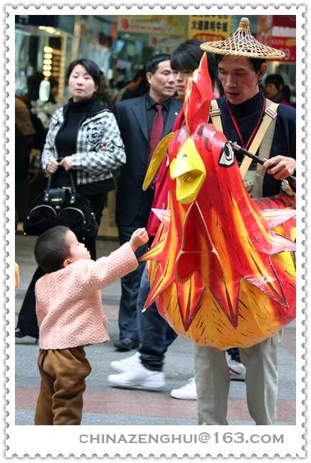 鸡公榄是广州传统的特色食品,卖鸡公榄的都要挂一个公鸡篮子,里面装着橄榄……味道很特别。我没吃过……呵呵。一个土生土长在广州50多年的同事,看了这张照片很惊讶!告诉我:现在卖鸡公榄的根本不化妆了,这是以前很传统的打扮,要擦脂抹粉,吹喇叭……