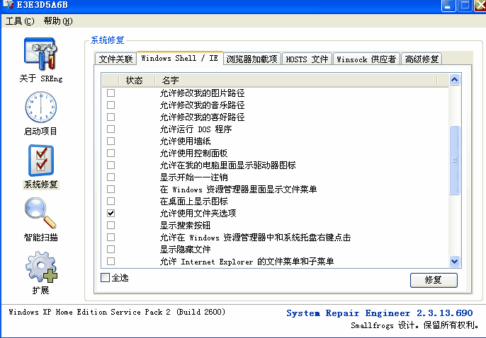 我的电脑不久前中毒,用最新版瑞星杀过后仍有以下症状:在控制面板中不能找出“文件夹选项”,进入文件夹后单击状态栏中的“文件夹选项”,没有任何反映。特此求救!!!