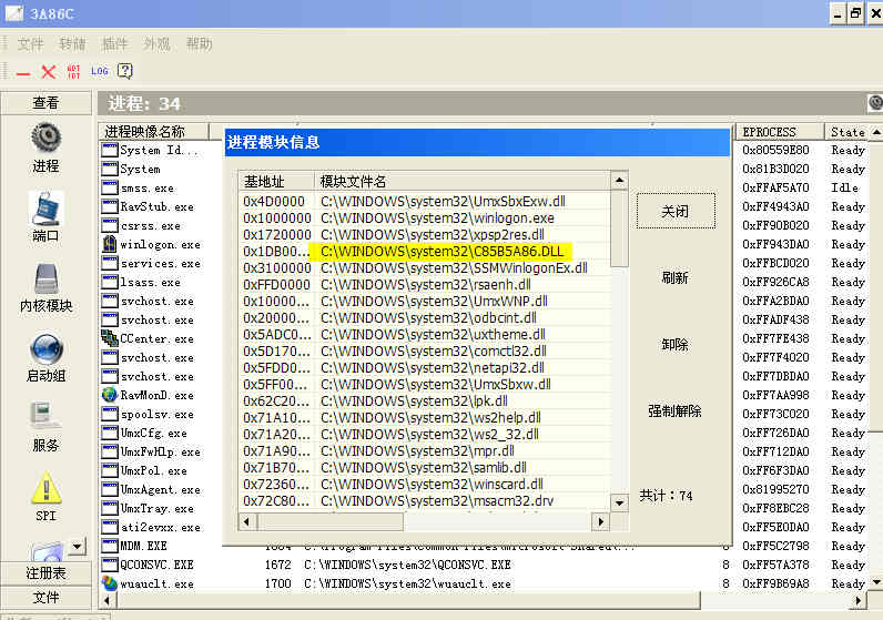 试图用IceSword强制卸除插入winlogon.exe进程中的C85B5A86.DLL————系统崩溃,蓝屏重启。