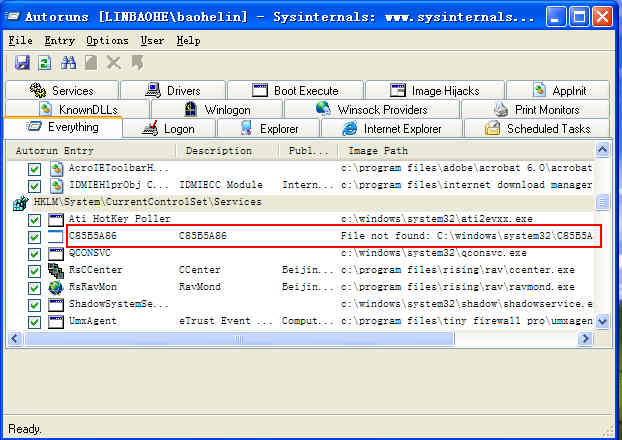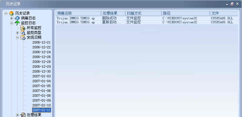 再次重启系统,看看瑞星的监控记录————C85B5A86.DLL被删除了(图4)。但是,注册表中服务项(图5)以及system32文件夹中的那两个.exe文件(图6),瑞星不管。得自己手动删除。