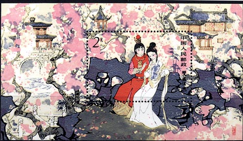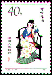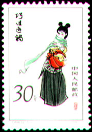 第十枚邮票“巧姐避祸”。巧姐年末及笄,母死父走后,舅舅竟要把她卖与他人做偏房。画中巧姐扮成乡下姑娘模样,还用披肩掩住半张脸,生怕被人认了出来,此时偏偏风刮起了披肩,引得巧姐惊恐地朝后看,形象地再现了她匆忙逃出时的情景。