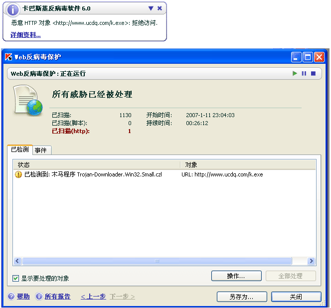 已经在安全模式下用卡巴扫描过电脑,没发现病毒。把无关的启动项取消后重启。运行QQ的时候发现木马,但又不能清除~于是把QQ卸了再装,但每隔几十秒后卡巴还是有提示的窗口弹出,并查看详细资料如下图: