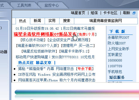 我用的是正版的瑞星,现在已经正常升级到2007最新版,可是刚才我打开瑞星发现右边的信息面板无法通过点击进入官网,点击任何一个连接都失效了,没有反应,可是在IE中却可以单独打开官网~~