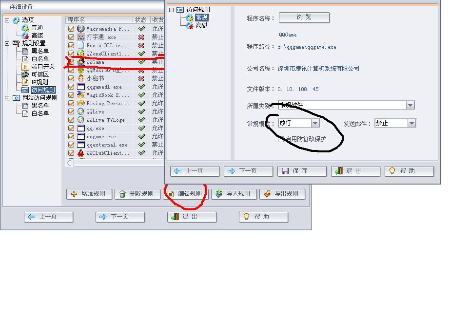 设置-详细设置-访问规则-选中qq游戏-点下面的编辑规则