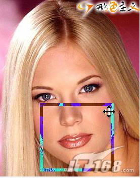 万事具备,只欠刷刷了。现在你就可以去MM脸上刷一下看看,发现了什么,是不是MM的皮肤马上好了起来了呢。那是因为我们用历史纪录画笔工具把当前画面的刷到高斯模糊时的状态。在刷的过程中。我们需要切换画笔不同的透明度来处理不同的部分,如下图红色线条,为脸硖的边缘部分。画笔透明度过大的话,导致照片没有线条,整体看起来就会有很模糊的感觉;绿色区域内为暗部,太大透明度看起来会很朦胧;青色线条为眼睛于眉毛的交界处。由于模糊的原因。此处几乎已经给模糊的几乎消失了,所以笔刷透明度为15%即可。应该注意这几个地方。皮肤与别的物质交界处(如头发),明暗交界处。