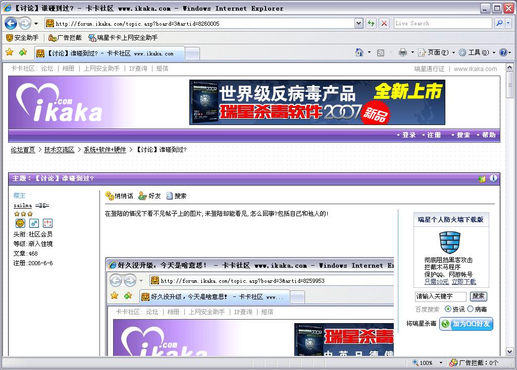 我在论坛里登陆的情况下看不见贴图,在不登陆的情况下却能看见,今天我在论坛的控制面板里的论坛选项里终于发现了原因,它默认的是不显示头像和贴图,改过来就正常了!害我到处找原因!希望有同样问题的按此解决!