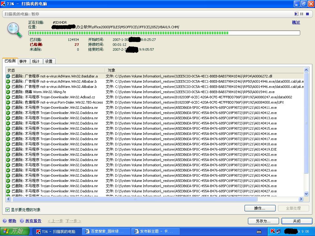 因为公司前两天买了卡巴,所以换着查下,没想到就查出这些,卡巴可以很顺利的删除,但是再查还有,好像老杀不尽,虽然感觉对平时操作没什么影响,但是看者心里难受,问问谁能告诉我怎么才能彻底杀掉呢,谢谢啦
