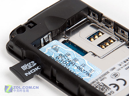 6300采用稍薄一些的BL-4C电池供电,由于容量并不像BL-5C以及6C那样大,只有860mAh,因此表现相对来说也比较一般。在我们的评测期间,以每天通过10分钟,收发短信20条,拍照15张,听音乐30分钟来计算,基本能够坚持两天两夜的时间。卸下电池盖的同时我们还可以在机身左侧看到诺基亚6300的第三方micro SD卡槽,而该机的标配中附带一张128MB此类型存储卡。
