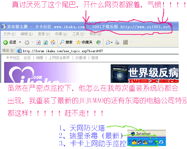 大家千万别上这个垃圾站无耻极点:www.sz1001.net,上了你也会跟我一样,主页被强制改为他的,这个也算了,而且更气愤的是,也是我这次发帖的原因,看图片:浏览器的标题栏上会有那讨厌的尾巴,真恶心!!!!!