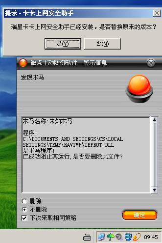 我有2台机子! 1台机子 光盘盘正版瑞星杀毒+光盘正版瑞星放火+卡卡+微 点  WINXP 相安无事情!