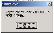 我运行一个名叫Share的软件,点击Share.exe后,出现一个对话框,上面写着:CryptGenKey Code:00000057. 参数不正确