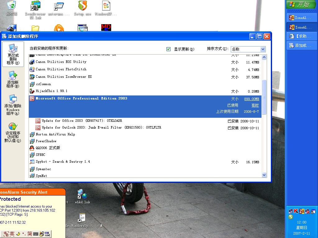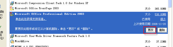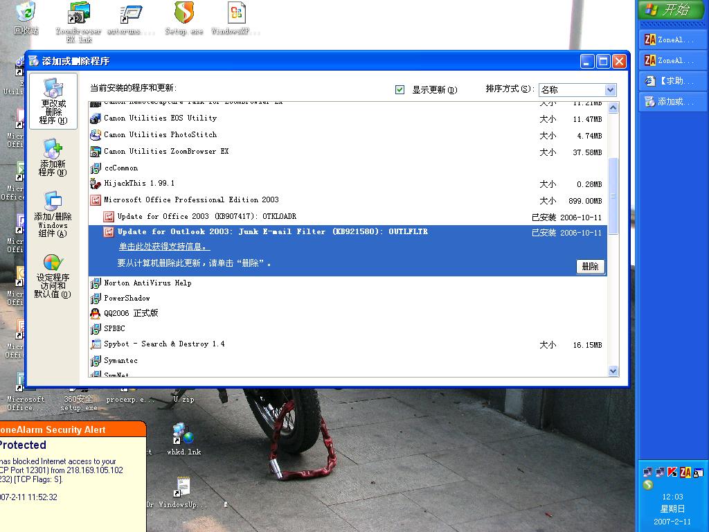 问题是我发现在“添加或删除程序”里,我的Office2003的卸载功能都没有,只有它的最后一个补丁还有此功能。(如图)。我不知这是要由补丁开始,逐一层次地卸或修复咧,还是因为我用Spybot-S&D清理系统时将一些卸载文件(包挂许多windows补丁的卸载文件)删除了的后果。