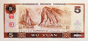 第五套人民币5元的背面图案是泰山,不过这个图案采用了空间“蒙太奇”的手法,把“五岳独尊”的石刻和泰山主峰两个场景放到一起,在现实中是看不到这样的景观的。泰山可以说是中国文化的第一高山,虽然它的海拔只有1546米,但却有极崇高的地位,是帝王祭祀天空和大地的地方,首先向世人宣布自己的皇权是顺应天道的。