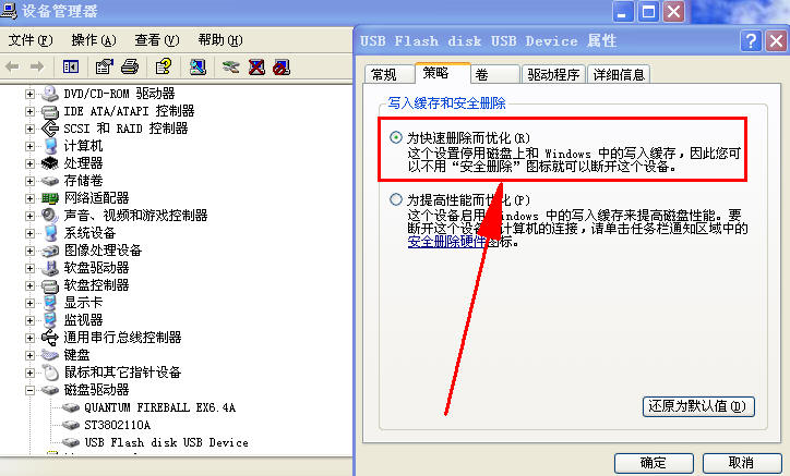 众所周知,当我们正在使用闪盘时,如果随便拔出,则有可能导致闪盘数据的丢失,因此,要拔下闪盘的时候,需遵循如下的操作:鼠标左键单击系统托盘的闪盘图标→“安全删除USB Mass Storage Device-驱动器”,这时就可以安全地把闪盘从系统上拔下来。但是,在使用时,许多人都会忘记这样来操作。闪盘真的不可以随便拔吗?事实并非绝对。在Windows XP中,鼠标右键单击桌面的“我的电脑→属性→硬件→设备管理器”,进入设备管理器窗口,双击“磁盘驱动器”,再双击在展开的“USB Flash disk USB Devic(闪盘设备称)”,进入“USB Flash disk USB Devic属性”窗口,单击窗口的“策略”项,点选“为快速删除而优化”项。这样,通过停用磁盘和Windows的写入缓存,你就不用再进行上述操作,直接拔除闪盘就可以了。参见下图片红框中所示: