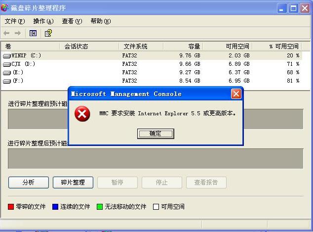 症状为窗口打开的同时出现下图的“mmc要求安装Internet Explorer5.5或更高版本”的提示,按“确定”后窗口、对话框均消失,无法进入窗口操作,但IE可以正常工作。