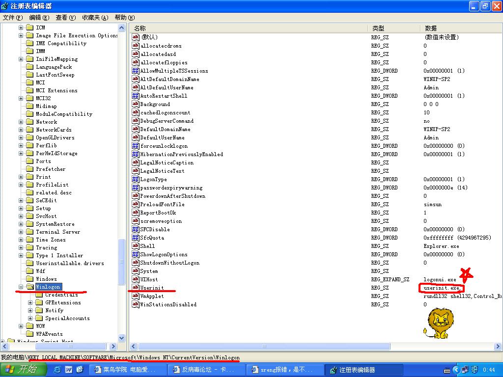 在SREng中 点 启动项目 --> 注册表 进入后 编辑<Userinit><userinit.exe,> 改成 <Userinit><C:\WINDOWS\system32\userinit.exe,>(留意逗号,不要删掉)