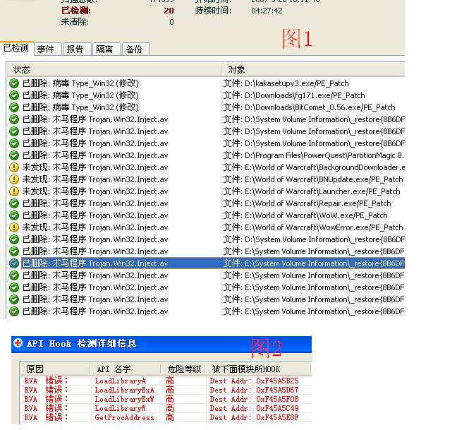 不小心中了个毒,卡巴就猛叫。叫得声嘶力竭~~~~——自动重启。。。开机,卡巴启动,继续叫。。——重启。。所以就直接GHOST了,C盘,上来把卡巴装上,更新后一查,发现除了C盘的EXE,外,DEF各盘的大多数EXE文件都不能使用了,而且被卡巴认为木马。只能全删。少数EXE还能幸免,感觉这个病毒感染EXE文件的顺序是按修改时间。“如图1”请问是什么病毒?他能感染所有盘的EXE,请问根据卡巴的提示将被感染并且不能使用的EXE文件全删后,是否算清理干净?