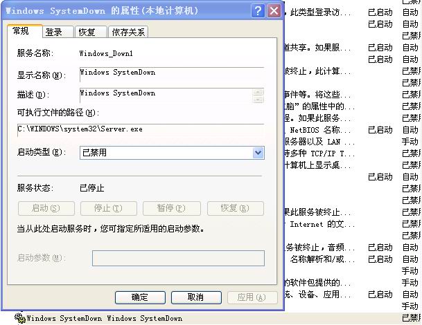 最近不知道中了什么网页毒,系统服务里多了个Windows SystemDown服务(如图),然后经常无故的自动往C:\Program Files\Common Files里下载一些EXE文件,还好我的瑞星防火墙阻止了程序的运行。后来我用卡卡助手发现了一个恶意插件,删除之。并且禁止了那个服务。但是现在我在下BT时,后台还是会自动启动IE(我平时不用IE,用腾讯TT),并且下载EXE程序到C:\Program Files\Common Files,用瑞星防火墙发现IE网页指向www.9i58.com/mycount.htm,用最新的瑞星病毒库全面杀毒没发现病毒。请问如何解决这个问题,谢谢!!