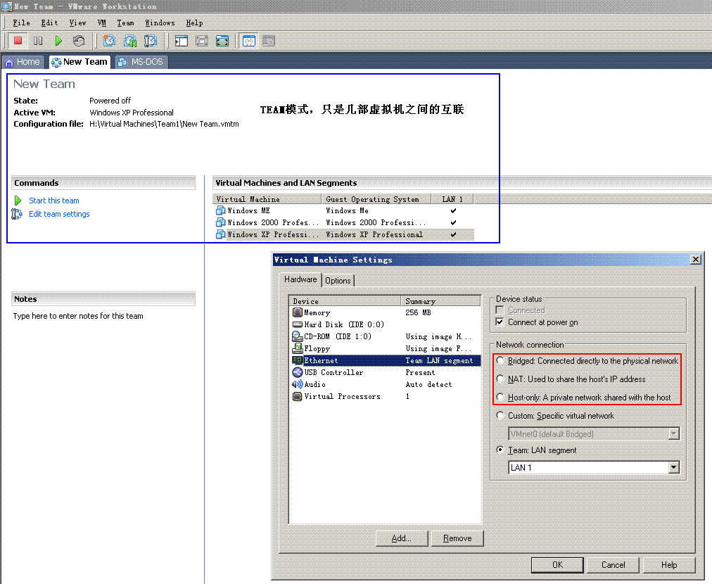 建议把“connected”和“connected at power on”都勾掉。或者,添加几个主机,然后使用team模式(只是几部虚拟机之间的互联)......
