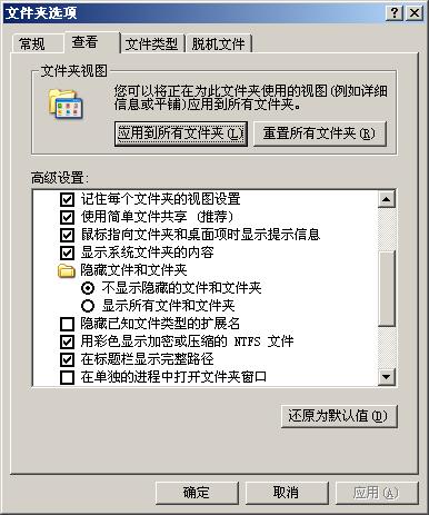 在文件夹选项中,选择显示所有文件,和显示系统文件,不起作用。再次打开文件夹选项查看,又回到隐藏状态。就像中毒的表现一样。