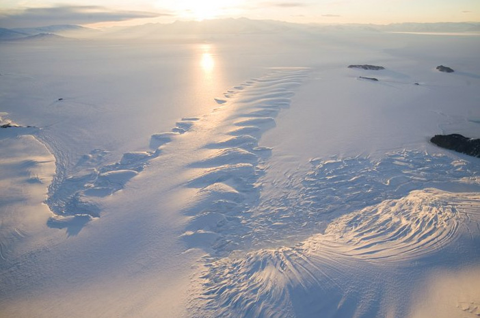 在巴恩冰川前,南部刮来的强风在沙漠中形成了新月状的沙丘。