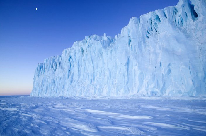 这是巴恩冰川的正面。南极大陆地表的海冰面积在每年10月达到最大、2月最小。海冰面的扩大有利于控制南极气温的上升以及海洋和大气中热量与湿度的交换。