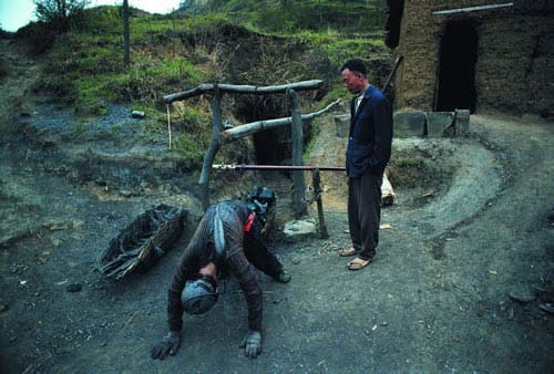 黔西小煤窑工人手脚并举将煤从洞中拉出,老板在旁察看磅重