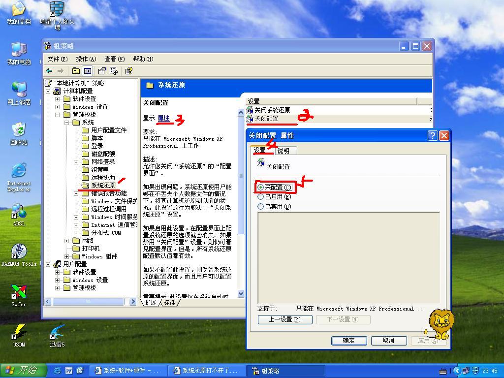 如果你足够细心,就会发现上图中还有“关闭系统还原”的标签,如果在该项的“属性”--“设置”里勾选了“已启用”,系统还原就被关闭了。这和用“系统属性”--“系统还原”标签下勾选“在所有驱动器上关闭系统还原”的功能是相同的。
