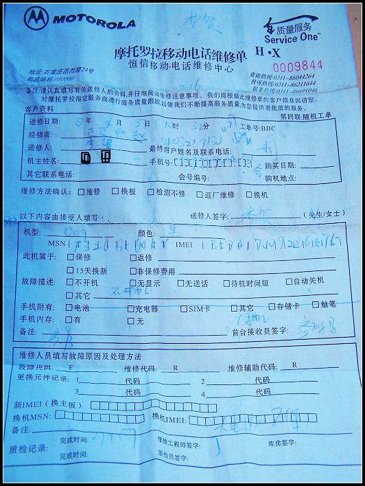 最“大”的全质量服务中心:我按照800的建议,来到了平安大街市一中对过的讯通服务中心(要知道现在平安大街正在断交修理,偶是徒步去的),来到这里心就凉了一半,只见整个讯通也就不到10平米吧,说句不客气的话,就比偶家厕所大那么一圈,而且没人,看了看表发现正好是下午一点,于是也理解了一下,去吃了偶迟到的午餐。下午2点回到讯通,发现还是没人,但发现了柜台上公示的营业时间是早8:30到晚17:30,更让人心凉的是恒信颁发的“优秀团队”的奖牌,看来这里也归恒信公司所属。到2点多终于从柜台后面界开的一个单人床左右的空间转出2个睡眼惺忪、衣着时髦的MM,看了偶的手机就一句话,找恒信吧,这里修不了。真不知道摩托罗拉怎么选择的全质量服务中心,说是2个,其实都是恒信公司的,看来石家庄的摩托罗拉售后全部由恒信垄断,难怪如此嚣张。