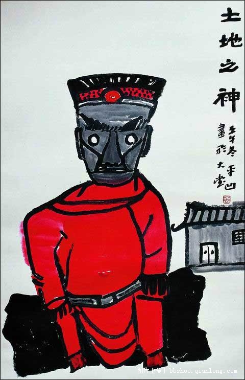 他说他是土地神,这话说得好。返回省城后,我常常想起他,想起他说的这句话,就画了这张“土地之神”的画。在中国的诸神中,土地神是最实在的神,他管的事多,也很威严,但他坐的不是殿,是庙,而庙又太小了。