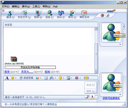 据介绍,该病毒会自动搜索电脑中MSN的联系用户名单,向所有的联系人随机发送带有诱惑性的英文消息如“My friend took nice photos of me. You Should see em loL!、check out my sexy books”等(我的朋友给我拍了些好看的照片,你应该看看……、看看我的性感书),并试图传送名为“photos.zip”的压缩包。