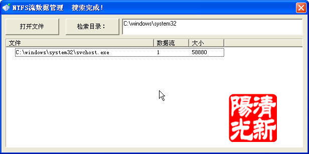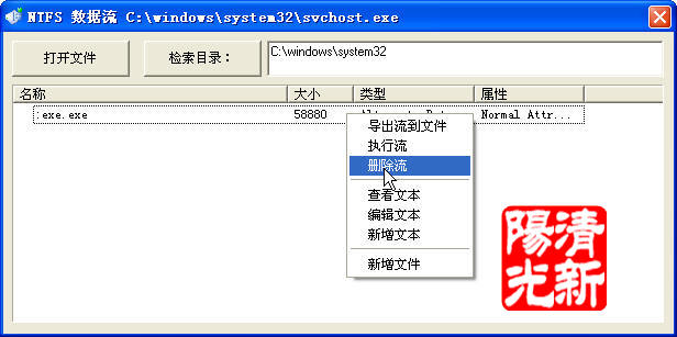 可以看到 软件检测到一个NTFS数据流 在C:\WINDOWS\system32\svchost.exe下面 双击检测出来的C:\WINDOWS\system32\svchost.exe