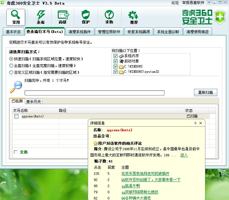 360安全卫士的木马扫描功能扫描电脑,结果提示发现qqzone (auto)木马,
