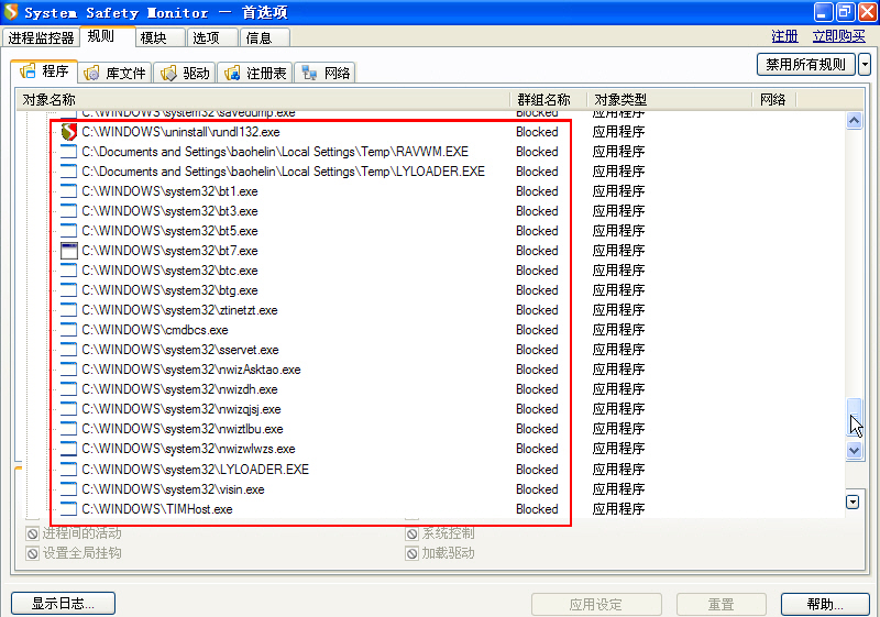 1、将病毒程序.exe、.dll、.sys录入SSM的规则组,阻止其运行(图1-图3);将SSM设置为自动运行。