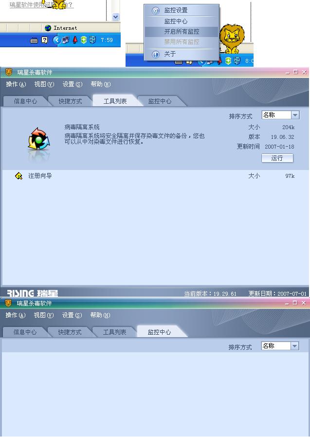 不知道怎么回事,今天打开瑞星突然发现瑞星监控打不开了,以为是病毒的原因,可是病毒库升级到最新也查不出毒。手动启动也启动不了。而且瑞星的监控中心中是空白的。如图: