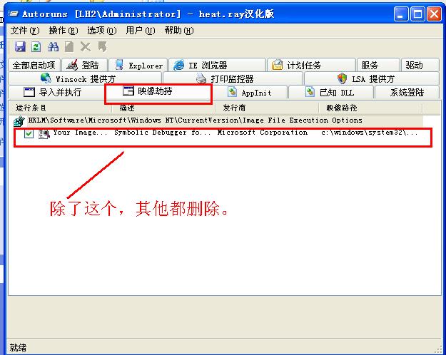 重启电脑,用autoruns改名运行。删除映像劫持里除了图中所示的,其他都删除。