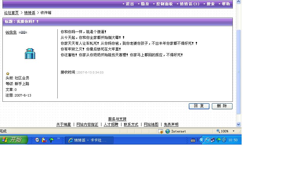 今一上线系统提示有悄悄话,结果是一叫"QQ虫虫"所发污辱客户的"悄悄话",查其资料是2007年6月新注册的黑客,瑞星网站一直是广大网民充分信赖的,难道会容忍这种社会渣滓公开污辱攻击你忠诚的老客户吗?请贵网站立刻处理,我们等待结果!现把其中一证据付上: