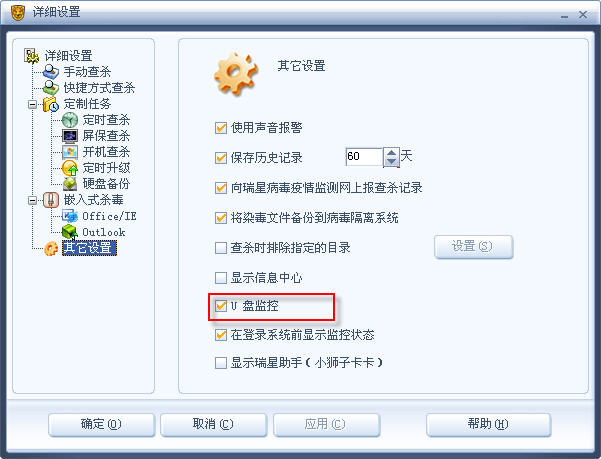 详细设置变化不大,但是多了U盘监控。如图