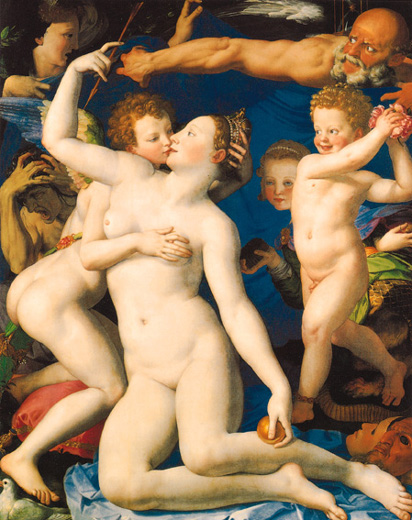 维纳斯与其子丘比特在画面中相吻,周围的伏尔太、罗马诗人维吉尔、鸽子与面具象征嫉妒、美、和平与虚伪。此画中维纳