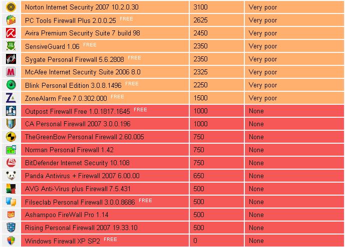 Matousec发布了最新的网络防火墙安全软件LeakTest评测结果,该测试通过多种攻击软件和手段对防火墙进行安全防护测试,结果显示不同品牌的防火墙防护能力差别相当大,在一些不合格产品中就有一些我们耳熟能详的老牌防火墙,Windows XP SP2的防火墙甚至创下了0分的"佳绩",还有瑞星也仅比XP好那么一点点--500分排倒数第二.以下是测试结果,大家可以参考一下.