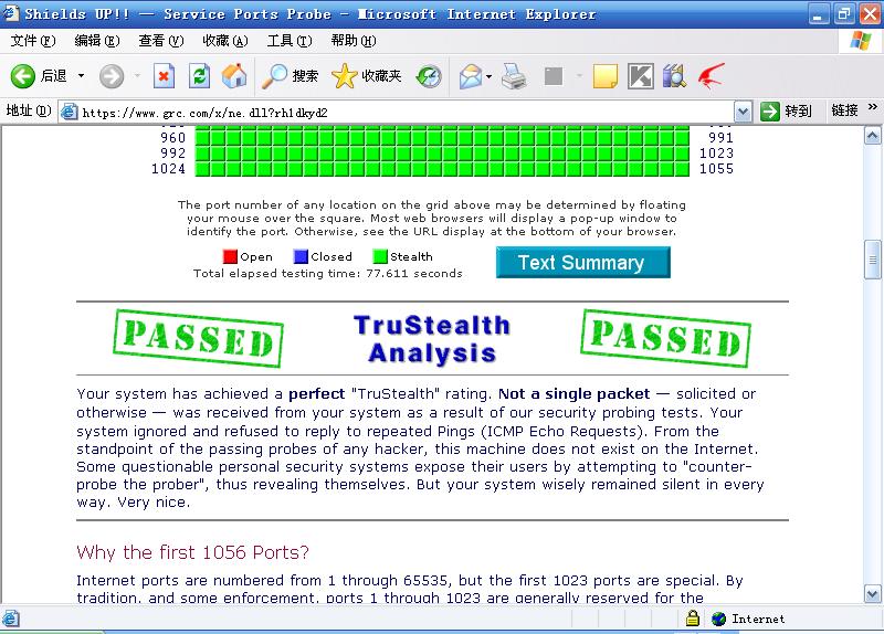 我用的是Tiny墙,刚才到久违了的(还是在用瑞星的时代去过)www.grc.com网站去试了一下,泄漏测试没时间没做,基本的“隐蔽”实验当然轻易通过啦!如图