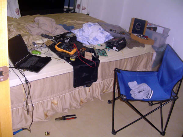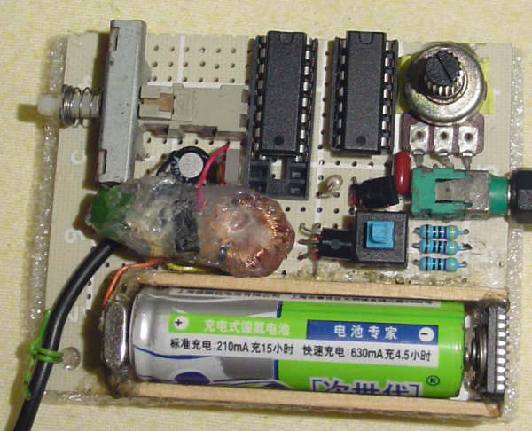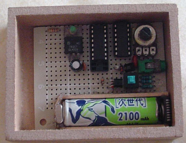 找不到16PIN的IC座,只好用20PIN来代替了,这里有7812做稳压,后来因为升压电路不够15V就取消了,还有取消了耗电的绿色LED,换了一个红色高亮度的,超省电。居然用10K的限流电阻,亮度不错,还省电。
