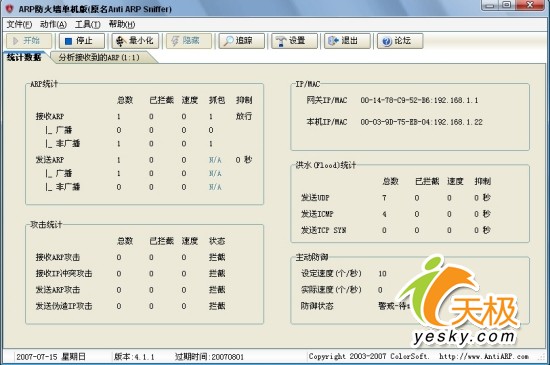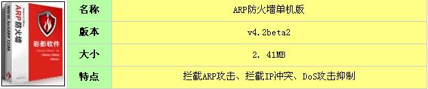 ARP防火墙拥有拦截ARP攻击、拦截IP冲突、Dos攻击抑制、安全模式、ARP数据分析、监测ARP缓存、主动防御、追踪攻击者、ARP病毒专杀等九大功能。并在系统内核层拦截本机对外的TCP SYN/UDP/ICMP/ARP DoS攻击数据包,定位恶意发动DoS攻击的程序,从而保证网络的畅通。其中主动防御技术使其主动与网关保持通讯,通告网关正确的MAC地址,以保持网络畅通及通讯安全如发现本机有对外攻击行为时,自动定位本机感染的恶意程序、病毒程序并将其清除。高速有效的为用户提供安全保障。