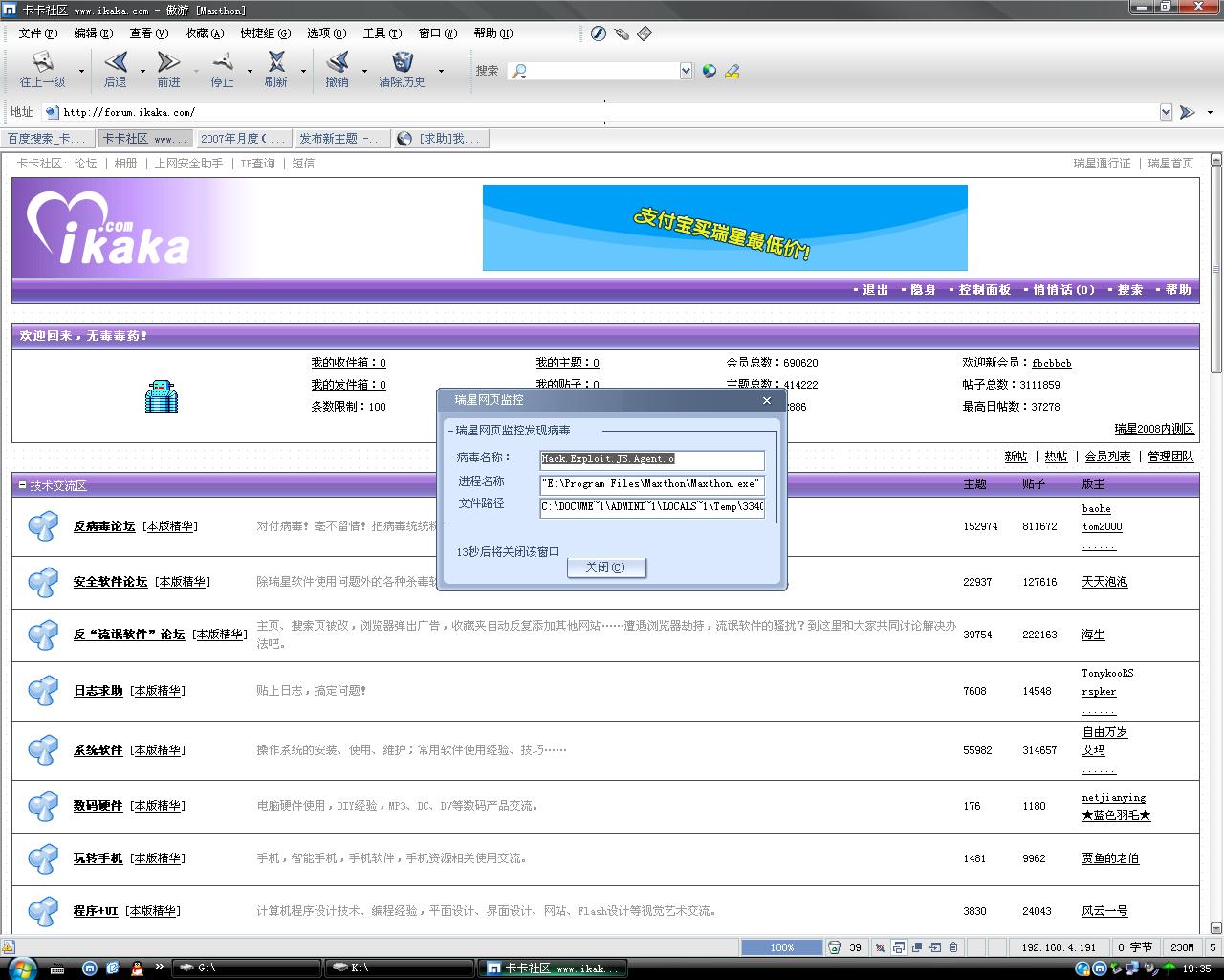 瑞星卡卡安全论坛技术交流区反病毒/反流氓软件论坛 【求助】Hack.Exploit.JS.Agent.o 病毒怎么删也删不掉,怎么办?