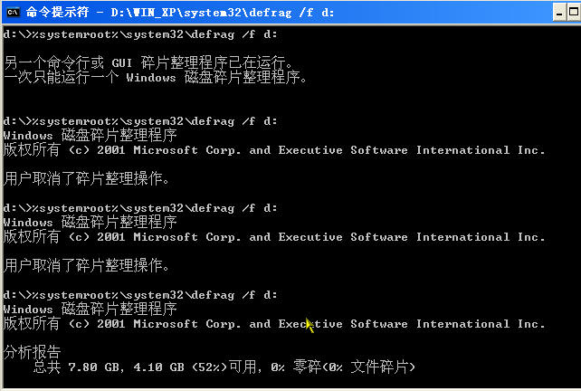 今天有空详细地查了一下DEFRAG命令的帮助文件,并且在本系统(XP_SP2)中实验成功,要想直接自动运行碎片整理程序的批处理程序的命令是“%systemroot%\system32\defrag /f x:”其中“x”是你指定要整理的盘符号,你就将上面的给的批处理命令修改为“%systemroot%\system32\defrag /f x:”这条就即可自动执行了。其中“/f”是强行运行的参数,它不管磁盘的空间是否低于15%都可以运行,在执行这条命令之后不过系统是在命令提示符下运行碎片整理程序的(它就不会出现在窗口中整理碎片那种界面了,参见下图片,如果要终止它执行可按下ctrl+c组合键终止)快去试试吧?